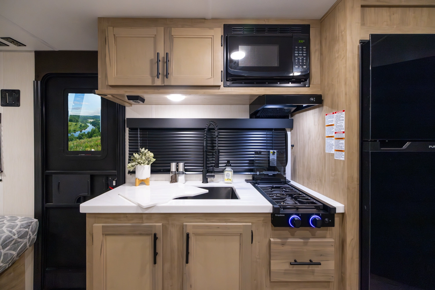 • Blackout Glass, Safety Slam, Friction Hinge Entry Door with Window and Shade Prep (N/A on LP models)