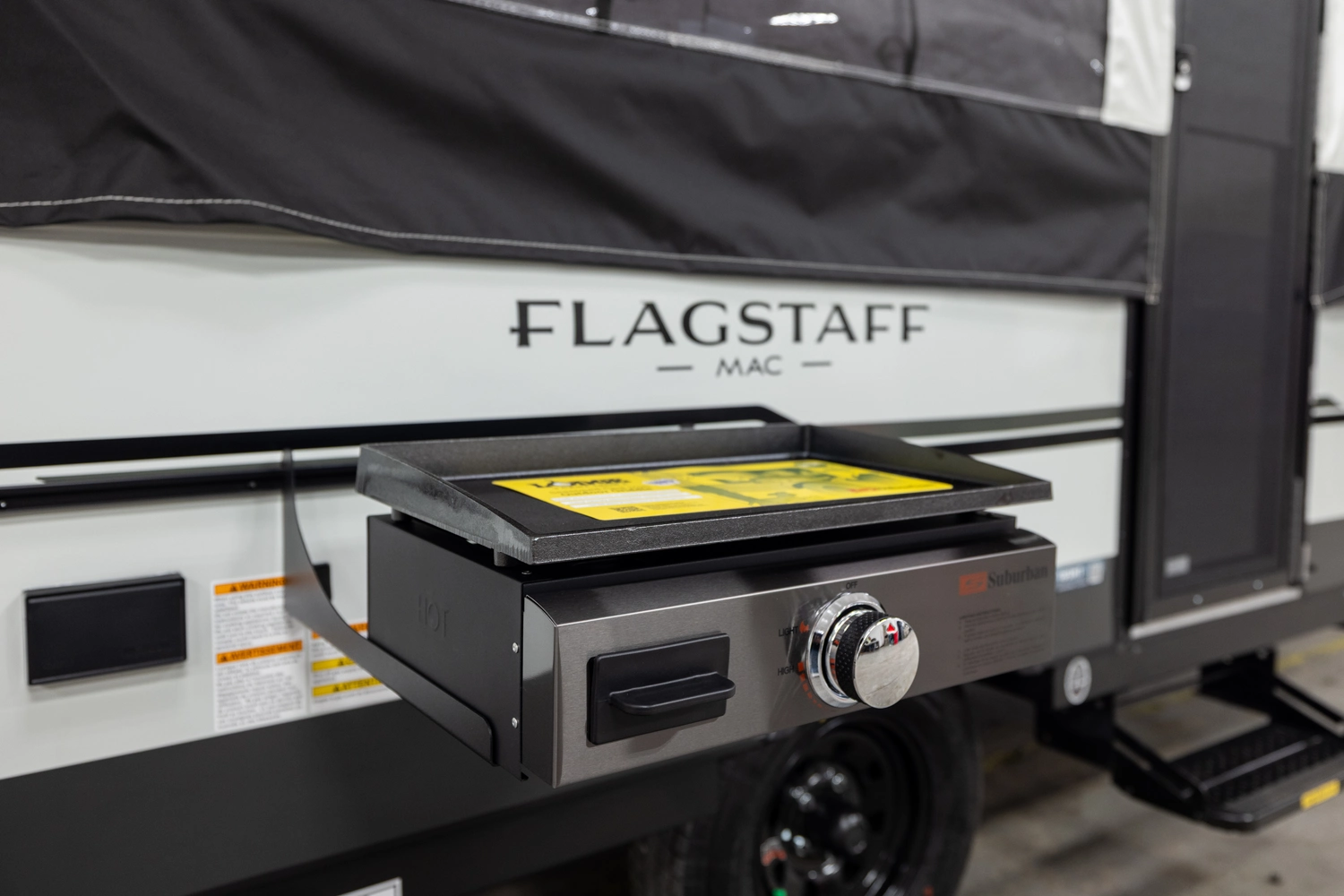 MAXIMIZING YOUR INVESTMENT FOR THE LONG HAUL. Elevate your camping experience with the unmatched quality of the MAC series line, enhanced by a host of additional features. Imagine the comfort of a Create-a-Breeze fan for optimal ventilation, the convenience of a power roof lift, an outdoor grill for culinary adventures, four stabilizer jacks for stability, and the warm embrace of brilliant LED awning lights that gracefully guide you back to your camper as the sun sets. Embrace the luxurious side of camping with your Flagstaff tent camper, where 'roughing it' becomes a thing of the past.