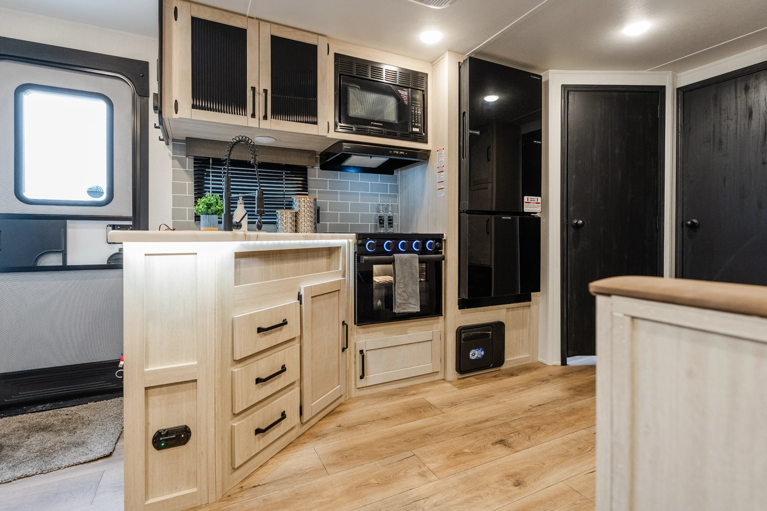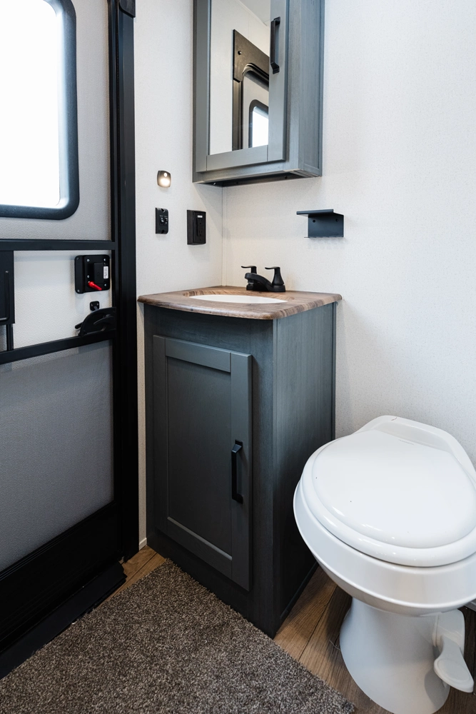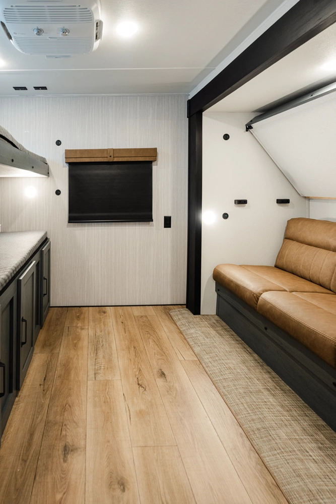 This bunk house travel trailer supplies you a great deal of space in the front bedroom. With a slide out and a large closet for all of your clothes, it will feel like your bedroom at home. The bunk house in the rear provides space for all guests to be comfortable and to make things a cut above, this floor plan provides two bathrooms. Furthermore, the exterior mini camp kitchen features a fridge and a griddle for those of you who like to cook in nature.