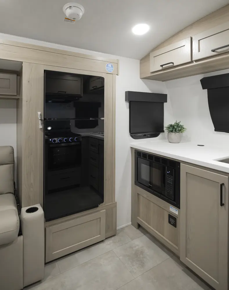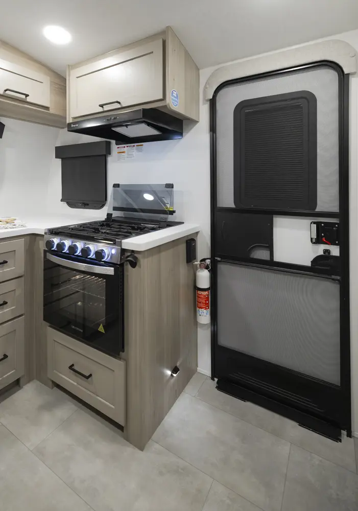 The 20FK is a compact trailer packed with big features! Our first dual axle Geo Pro gives you improved stability and towing confidence in a lightweight design. The front kitchen offers excellent counter space while the rear sleeping area and slide-out create a comfortable, open living space. At just over 21 feet, and around 4,200 lbs., the 20FK delivers easy towing with the durability and off grid features that Rockwood is known for.