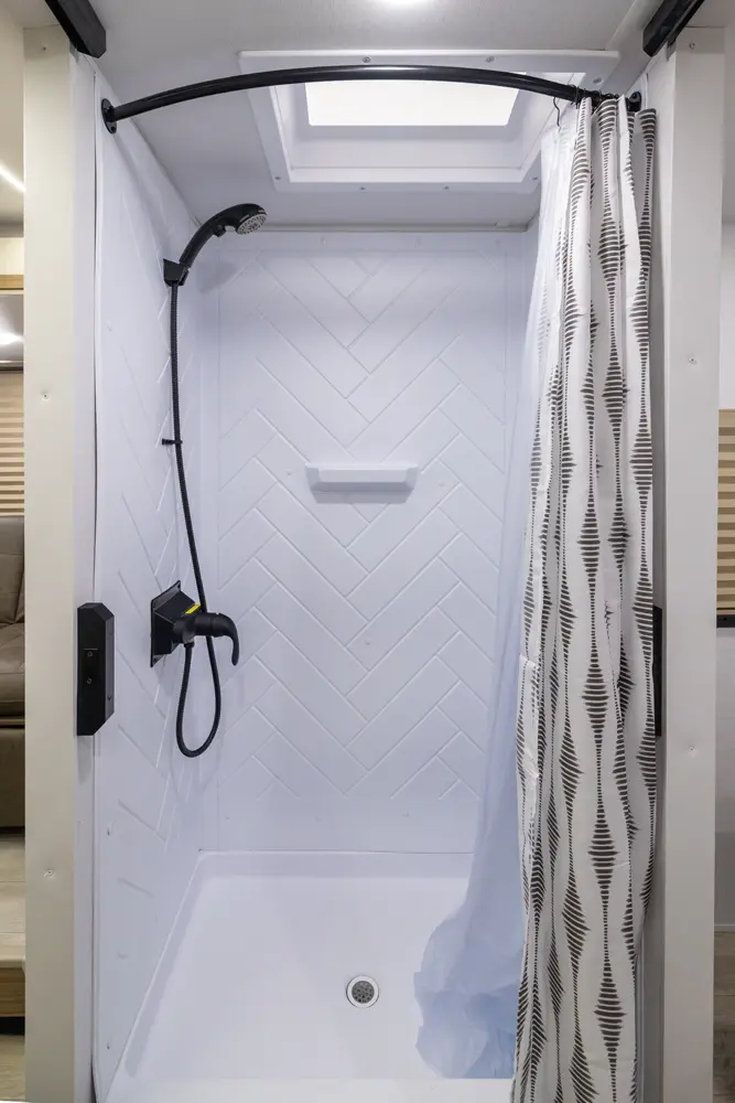 • Large 36x24 Shower Pan w/ Shower Surround + Waterproof Retractable Shower Door (No Curtain)