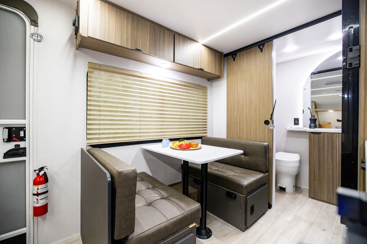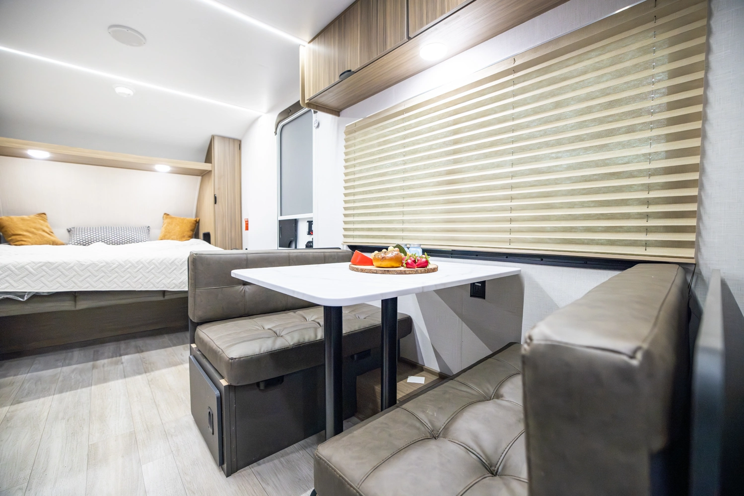 The 167RBK is just over 3,000 lb. of compact, yet feature-packed fun! The queen bed in front flips up to provide sofa space during the day, with end tables for extra storage and convenience. The booth dinette and large window give you great breakfast views, while the large rear bathroom provides a bit more elbow room than you'd expect—plus a bonus linen cabinet!