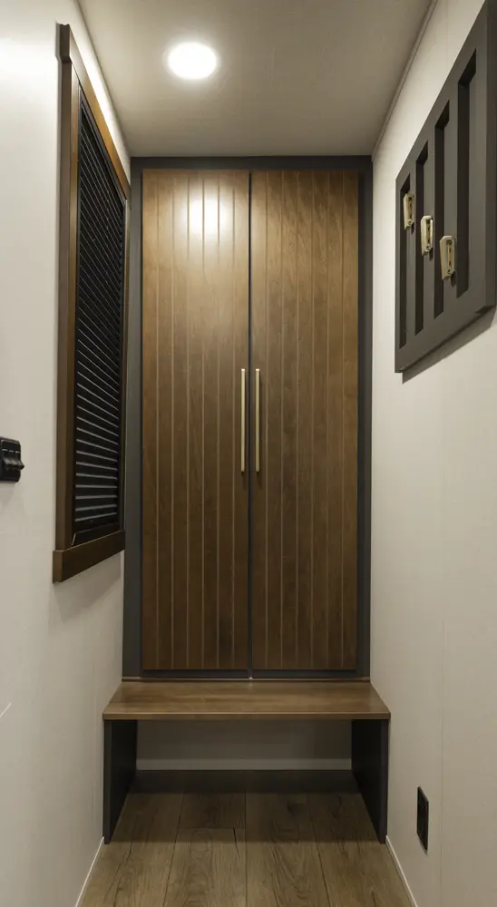 The 412FWC maximizes space with functionality. Step through the massive 38" entrance door and into the mud room, or relax on the L shape sofa and watch TV. This coach also features and area to work with a flip up desk, or an area to entertain with a wine bar. Interior features like custom cabinetry blends with modern amenities like a washer and dryer, adjustable shelves, king bed and more to provide the ultimate stay.