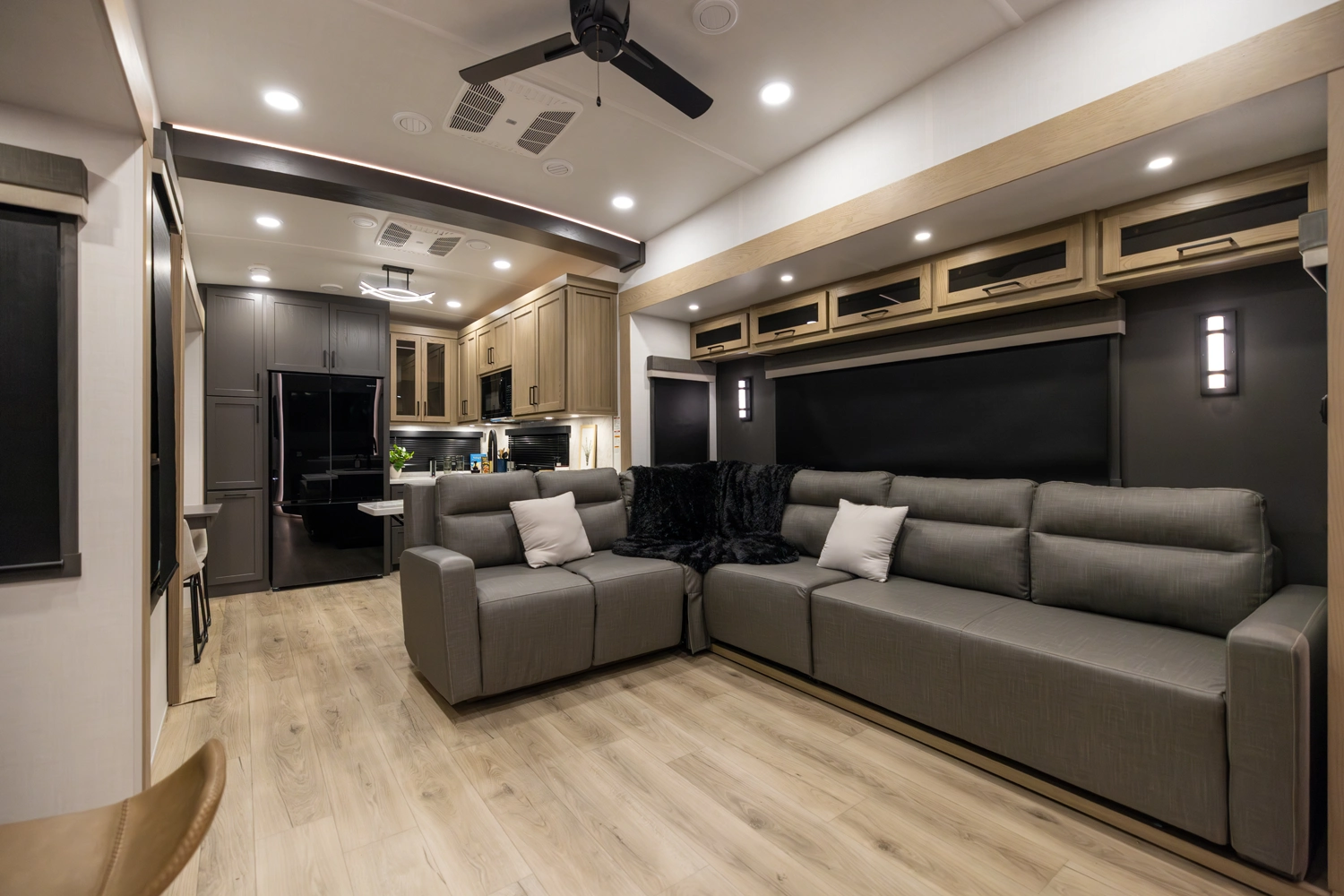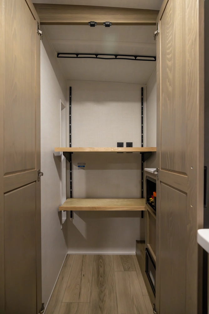 This 101" Wide Body fifth wheel is a rear kitchen layout features expansive counter space, residential style appliances, and abundant storage, making it ideal for those who love to cook while traveling. The mid living area features an L-shaped sofa with an integrated Hide-a-bed and 52" theater seat that requires no dismantling when the slides are retracted. Up front you have a private bedroom with a king bed and generous wardrobe space that is Washer/Dryer ready!